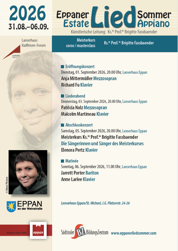 Im Rahmen des Eppaner Liedsommers 2026 wird ein Meisterkurs von Ks.in Brigitte Fassbaendergehalten. Die Anmeldung zum Meisterkurs ist bis zum 08. Mai 2026 möglich.